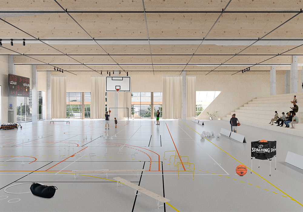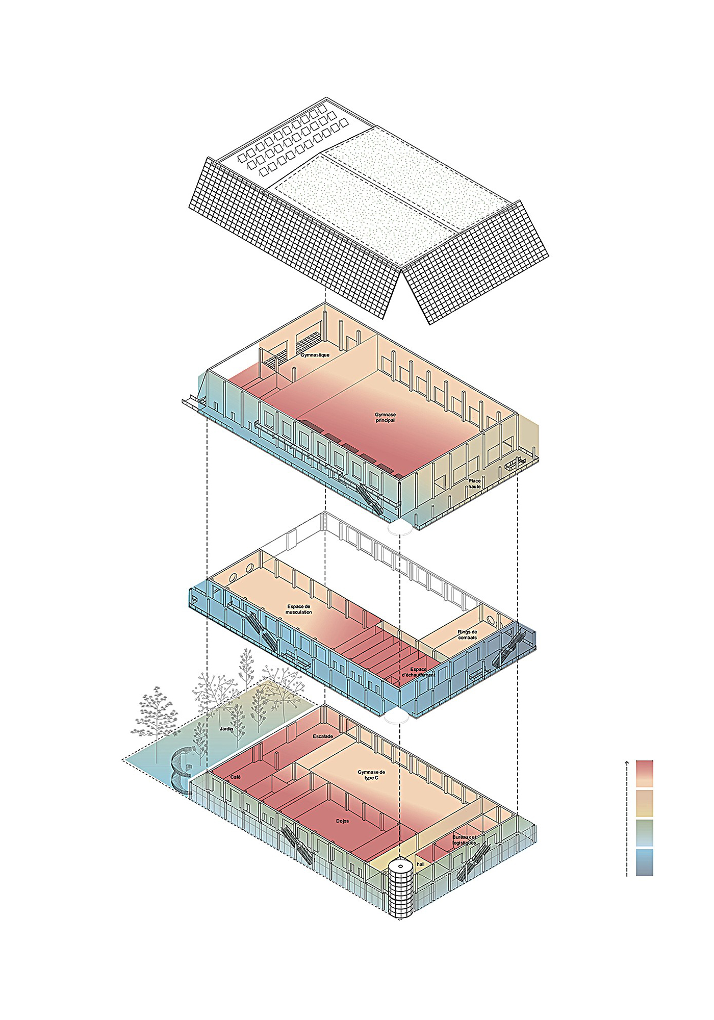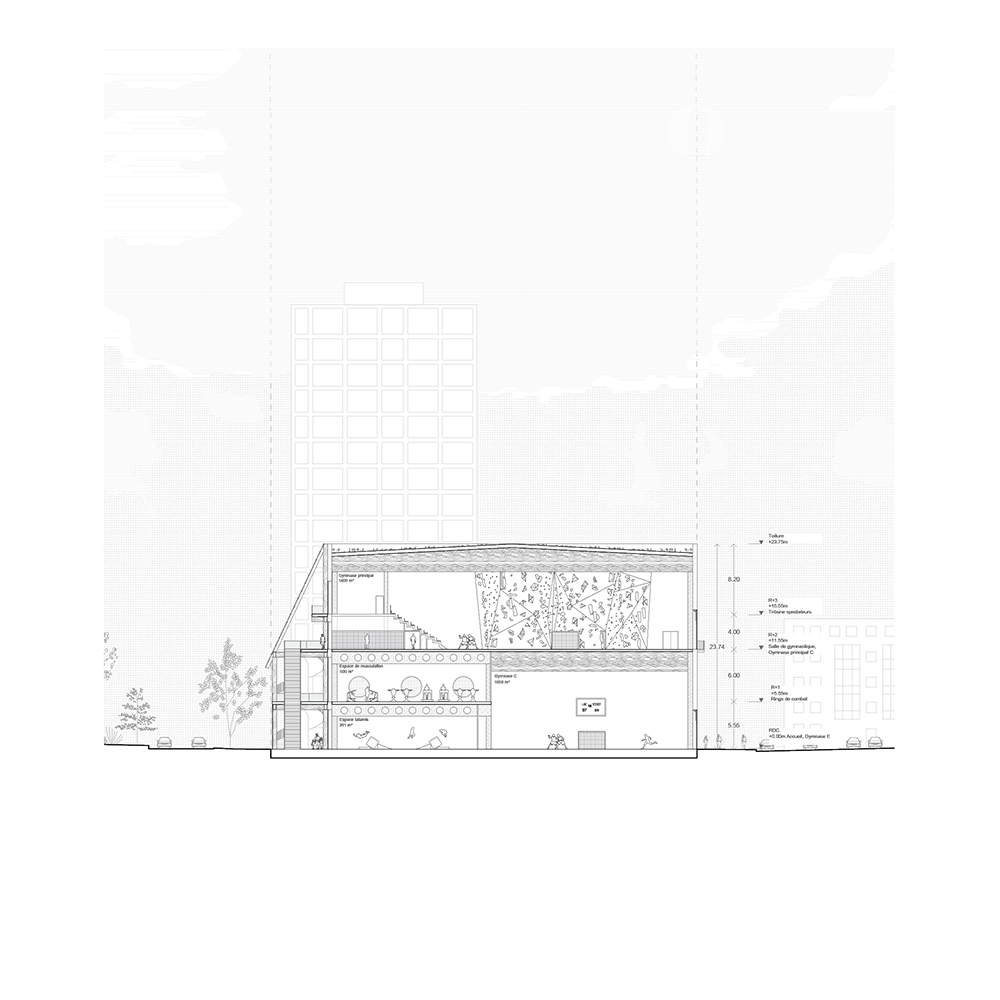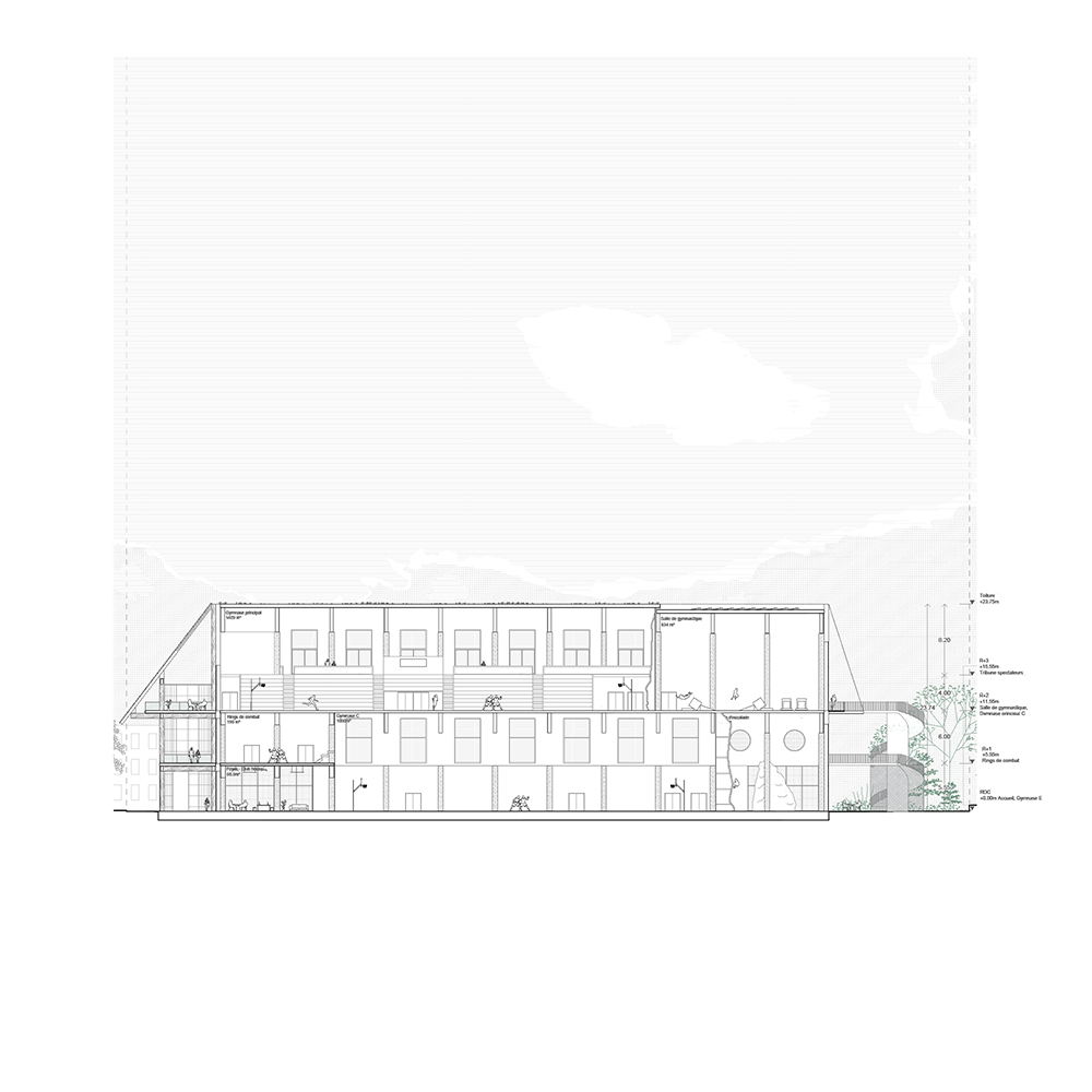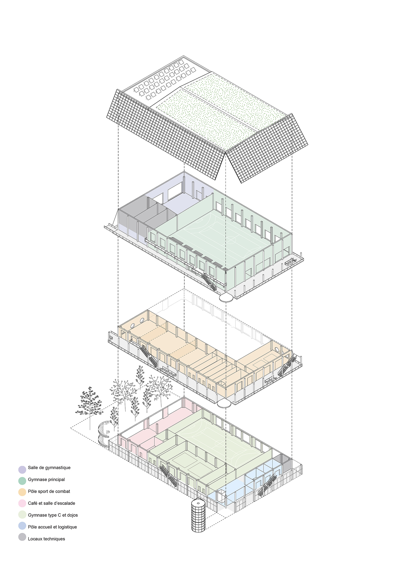 Le projet Sports Fertiles, imaginé dans la dynamique des JOP 2024, propose un complexe sportif emblématique au cœur du Val Fourré, alliant sport, nature et architecture dans une démarche sociale et environnementale forte. Implanté en entrée de quartier, il s’inscrit dans la continuité des espaces publics et intègre un jardin en pleine terre pour répondre aux enjeux climatiques. Son architecture bioclimatique, en bois et verre, associe compacité, transparence et sobriété énergétique. Notre proposition inversait le programme en plaçant le grand gymnase en hauteur, ouvert sur la ville et le grand paysage, comme un belvédère sportif. Articulant gymnase de proximité et lieu d’élévation, le bâtiment devient un lieu de vie, de rencontre et de transformation urbaine, catalyseur d’un renouveau pour le territoire.