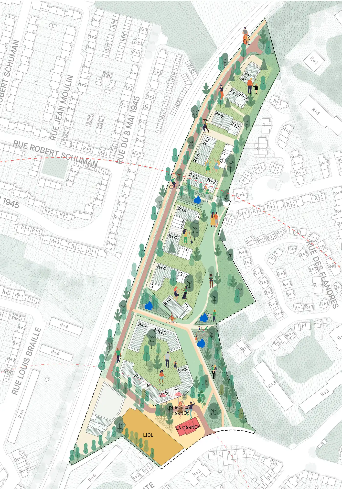Located in the northwest of Lille, along the Deûle River, Lambersart stands out for the quality of its living environment. Less than 500 meters from the Pont Supérieur metro station, the Bonte sector represents a strategic opportunity for urban development within the Lille metropolitan area. Currently, the site is difficult to access and barely visible. Revealing it to all residents of Lambersart offers a remarkable opportunity to develop a more sustainable, context-sensitive urbanism.