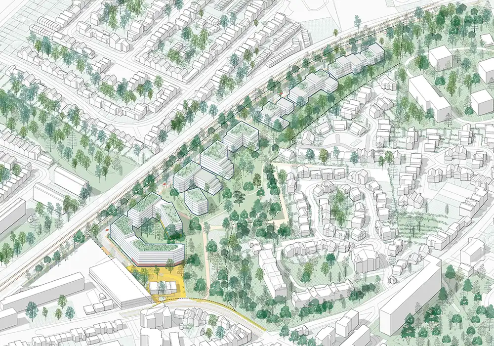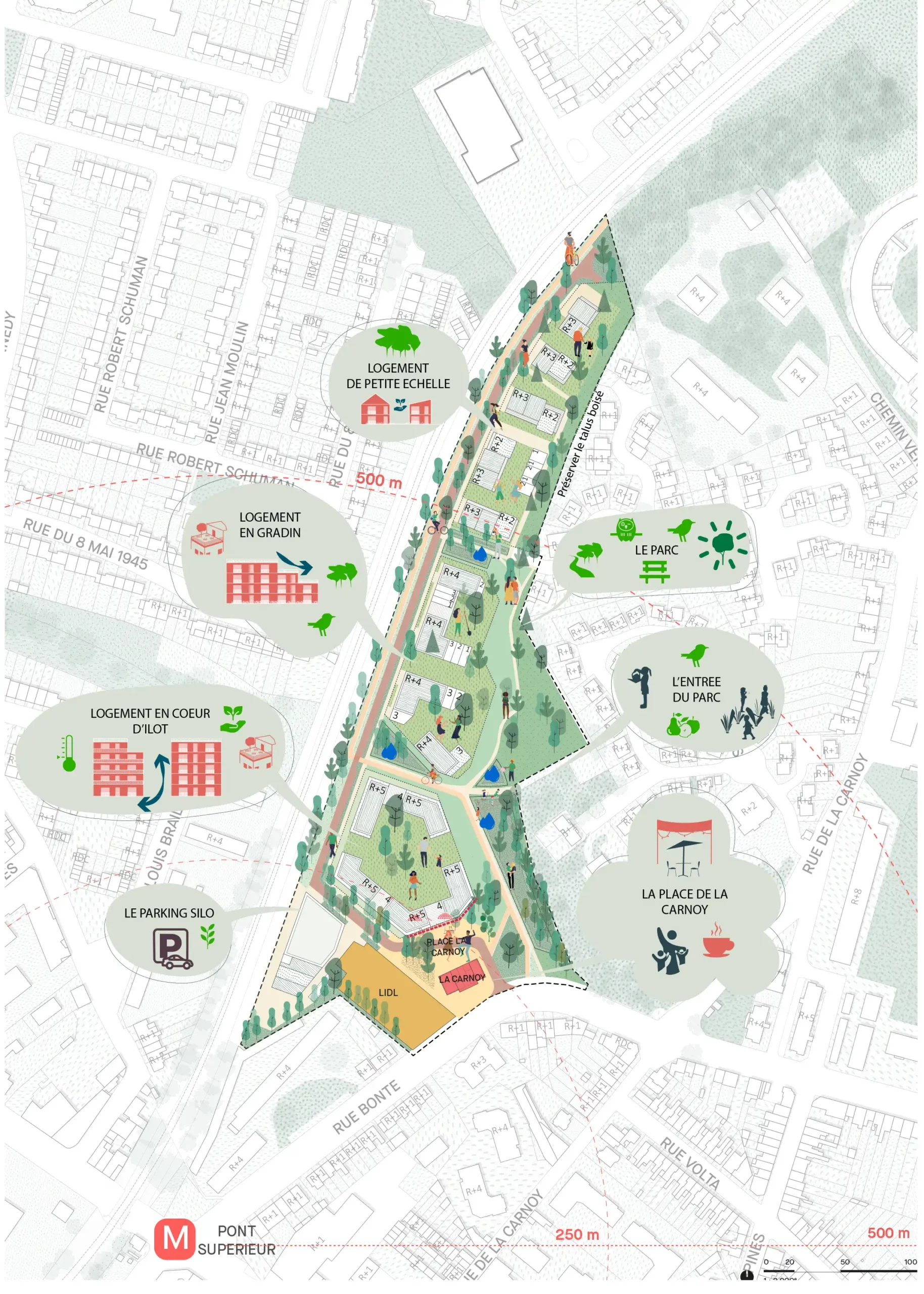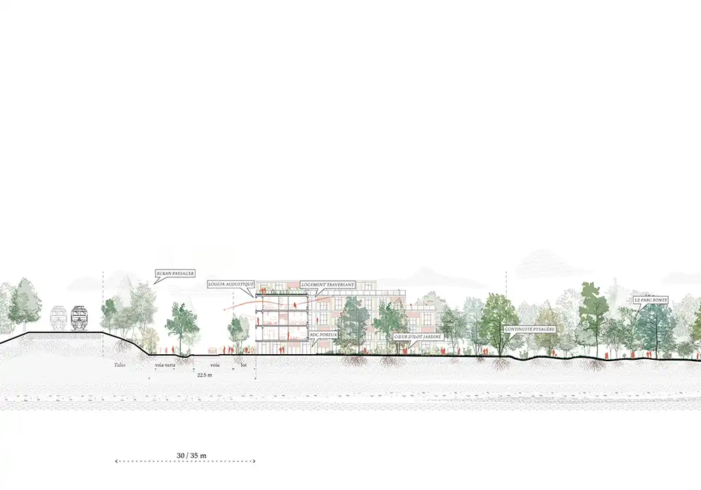 Nous héritons d’une situation urbaine avec un cadre paysager exceptionnel et des potentiels de résilience importants pour la biodiversité et la nature en ville, une réduction de l’impact environnemental, et un cadre de vie renouvelé. L’enjeu est de préserver ce site comme une lisière paysagère des quartiers limitrophes tout en y développant des lieux de vie et de rencontre favorisant l’appropriation du site et le vivre-ensemble. Il est crucial de tirer parti de cette situation paysagère exceptionnelle pour en faire un levier de transformation, passant d’une situation d’enclave à un lieu fédérateur dans la ville. La friche permet cela : d’un côté, sacraliser un espace de nature en ville, et de l’autre, ouvrir le champ des possibles, servant ainsi d’état de transition pour ce site. Nous sommes convaincus qu’un urbanisme de situation durable constitue le terreau d’un cadre de vie fédérateur entre les futurs résidents et les habitants des quartiers voisins.